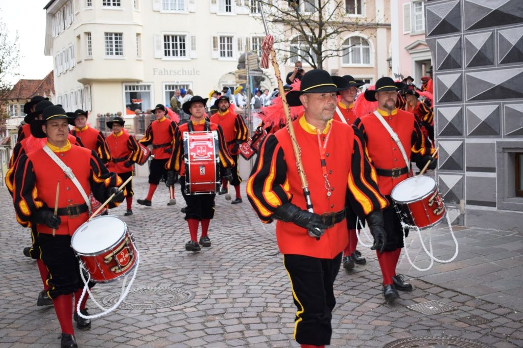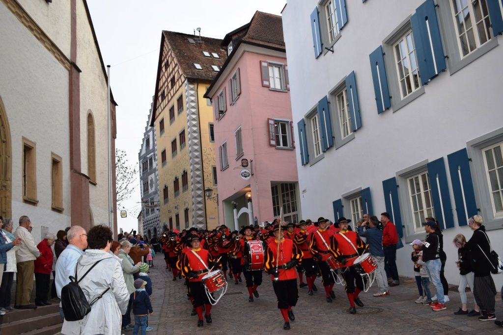 Und sie haben sich etwas einfallen lassen….:)  . Bereits im April gings weiter, das zweite FZ Halbjahr konnte starten. Mit einem Besuch beim Historischen Fanfarenzug Engen wurde die Sommersaison eröffnet. Zwölf Fanfarenzüge schlängelten sich durch die malerische Altstadt von Engen um danach zusammen in der Stadthalle abzufeiern. Begleitet wurde das ganze von Nachtwächtern aus ganz Baden-Württemberg, die in diesem Zusammenhang ihr jährliches Treffen gefeiert hatten. Eine ganz tolle Idee mit farbenprächtigen Zügen u. historischen Nachtwächtern.